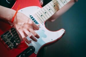 鉄塔のてっぺんに登って決めポーズでエレキギターを奏でるギガさん。