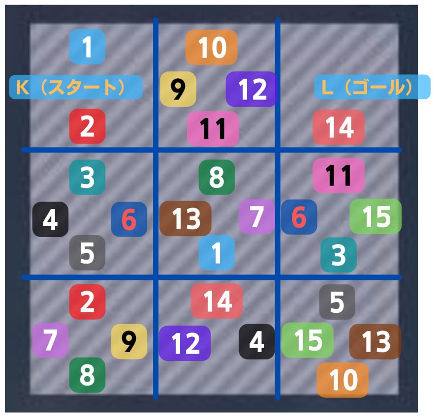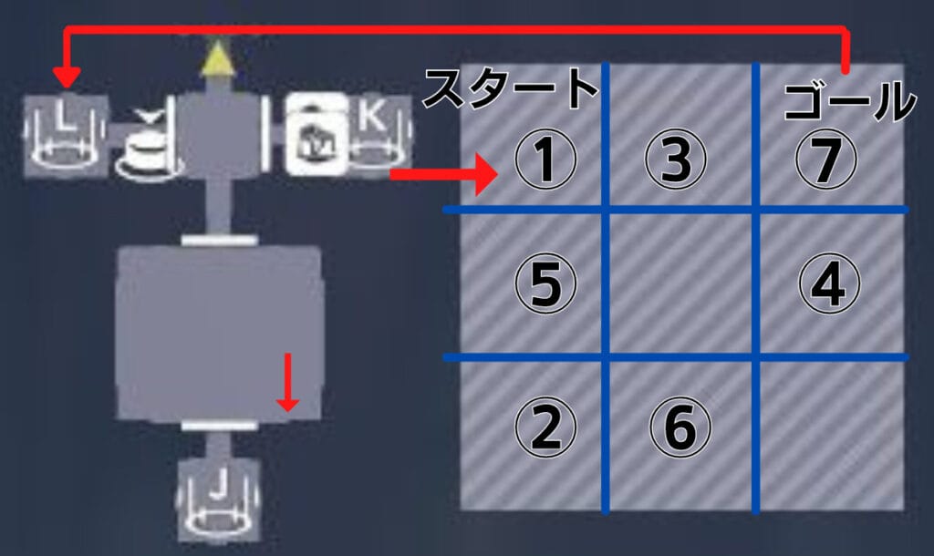 下の図のように、迷路の中は9区画に分かれていて、ワープ装置で行ききするというつくりになっています。図にふっている数字が、通る順番になります。