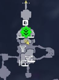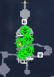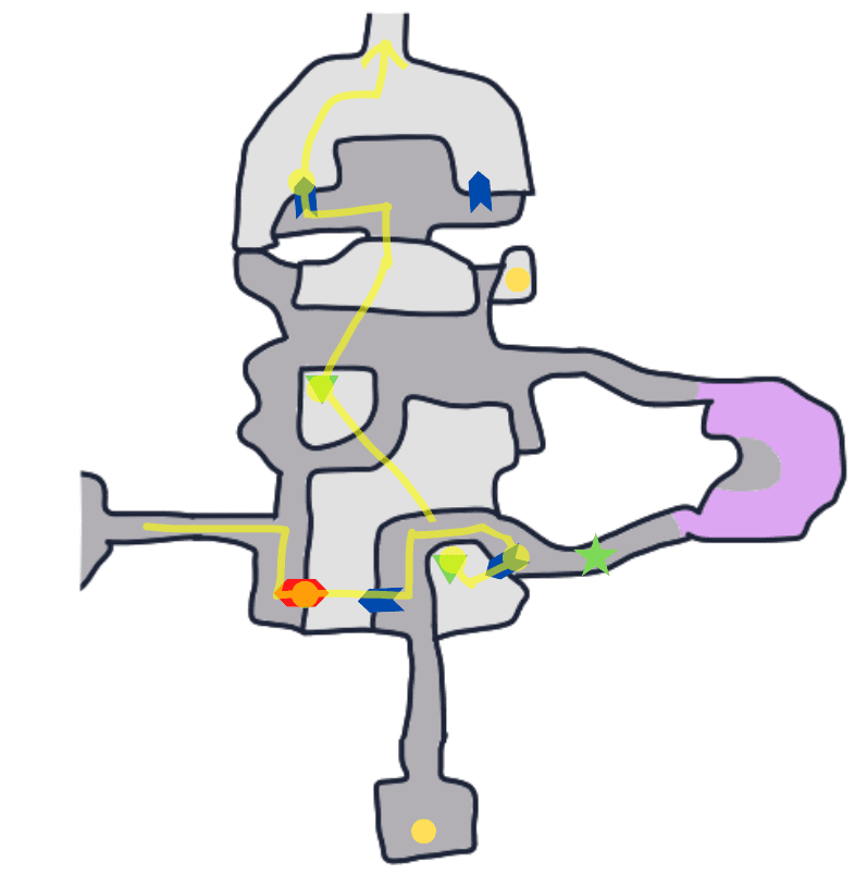 星の生まれた場所」の「Ⅲ・はじまりへ至る螺旋」の後半部分というのは、地図で言うと黄色の枠で囲んでいる場所です。ひととおりハシゴなどはかけ終わってたどり着く、いちばん奥の部分になります。