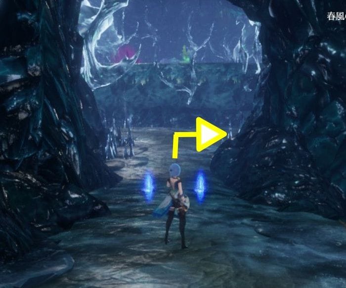 そのまま、目の前の岩(風をまとう緑の装置がある岩です)を時計回りにまわりこんでください。
