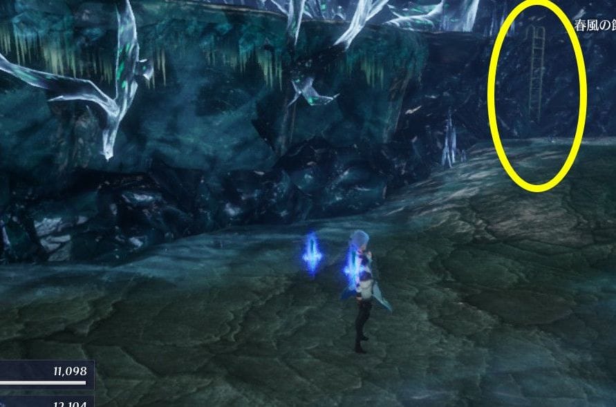 奥のほうにハシゴがあります。そのハシゴを登りましょう。