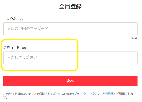 「招待コード」の欄がでてきますので、ここに